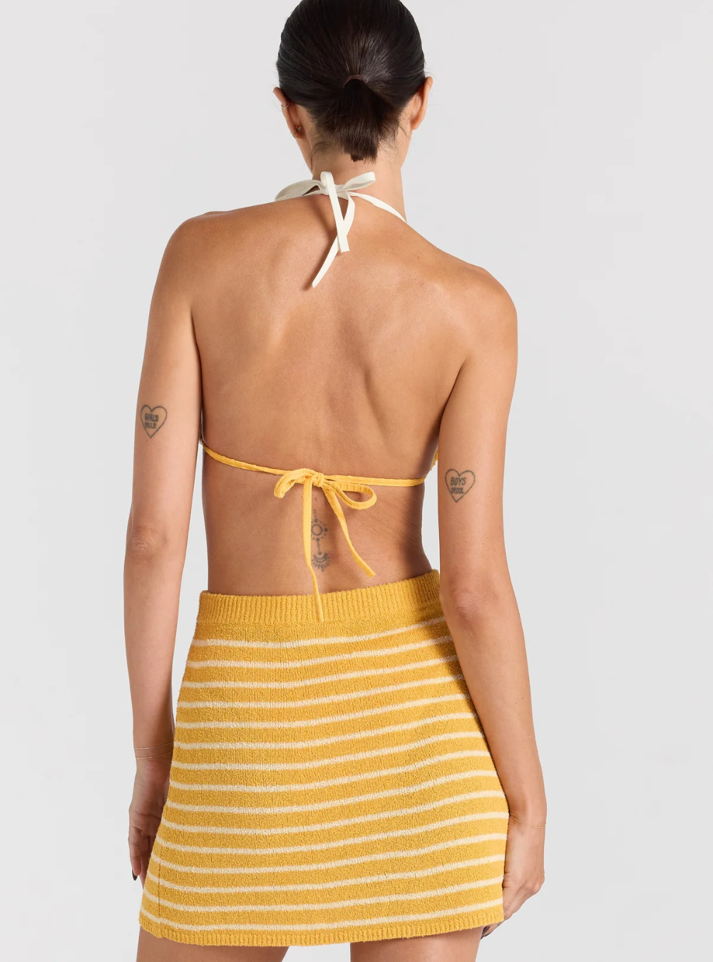 The Surfside Mini Skirt is an effortless warm-weather staple designed for easy summer days. Crafted from a soft, textured knit with yarn-dyed golden yellow and ivory stripes, this mini skirt features a relaxed fit that sits comfortably on the body. Lightweight and breathable, it’s perfect for poolside lounging, beach walks, or sun-drenched afternoons, capturing a timeless, carefree summer mood.