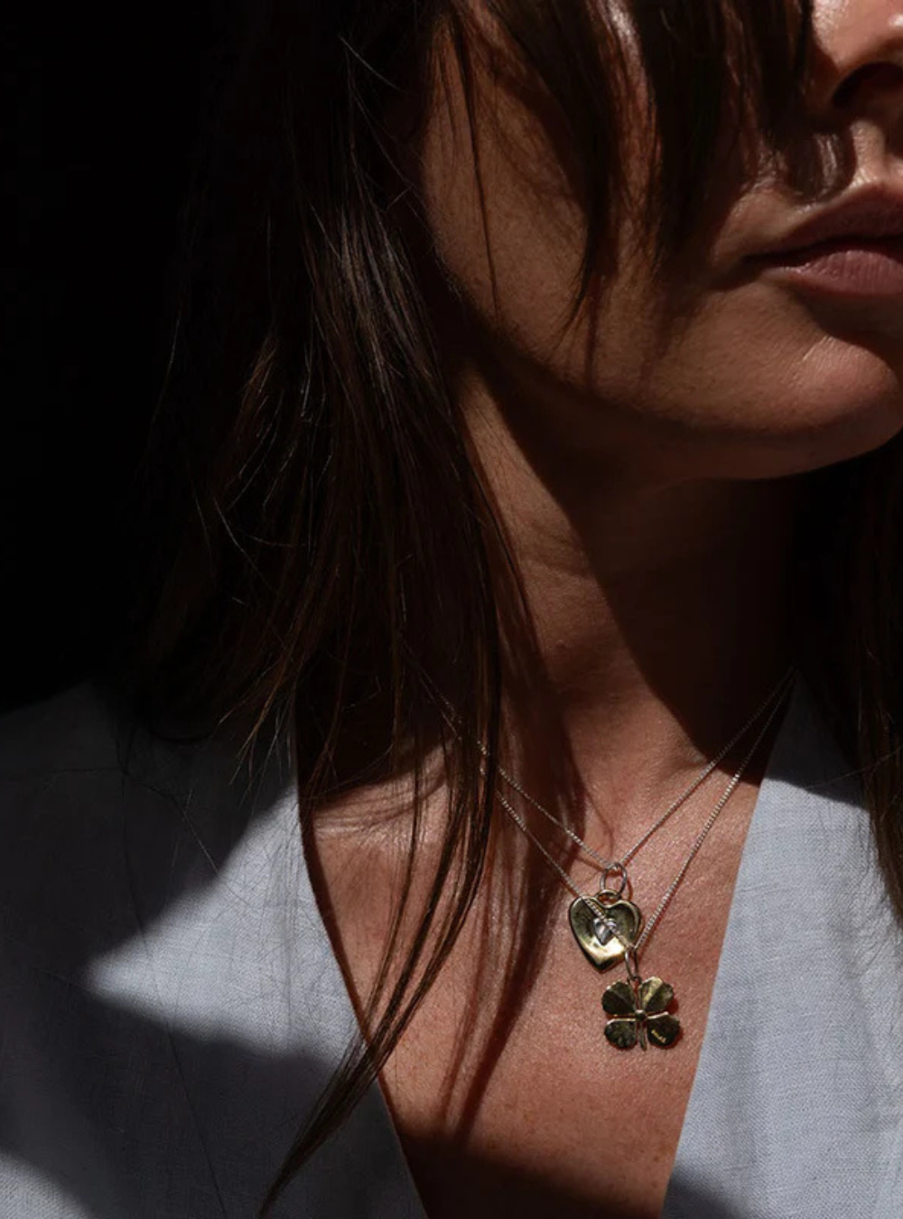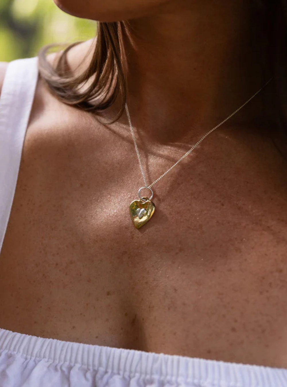 A solid yellow brass large heart, with small raised sterling silver heart inside and sterling silver jump ring. Stamped with PALAS on the back.