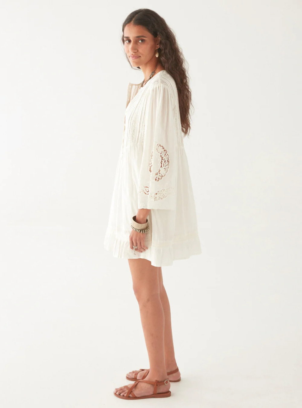 Soft, effortless, and just a little bit untouchable. The Clementine Dress plays between innocence and quiet allure, with delicate lace tracing the bodice and cut-out embroidery adding a whisper of skin. The billowy sleeves bring a touch of romance, while the short hemline keeps it fresh, playful, and undeniably feminine.