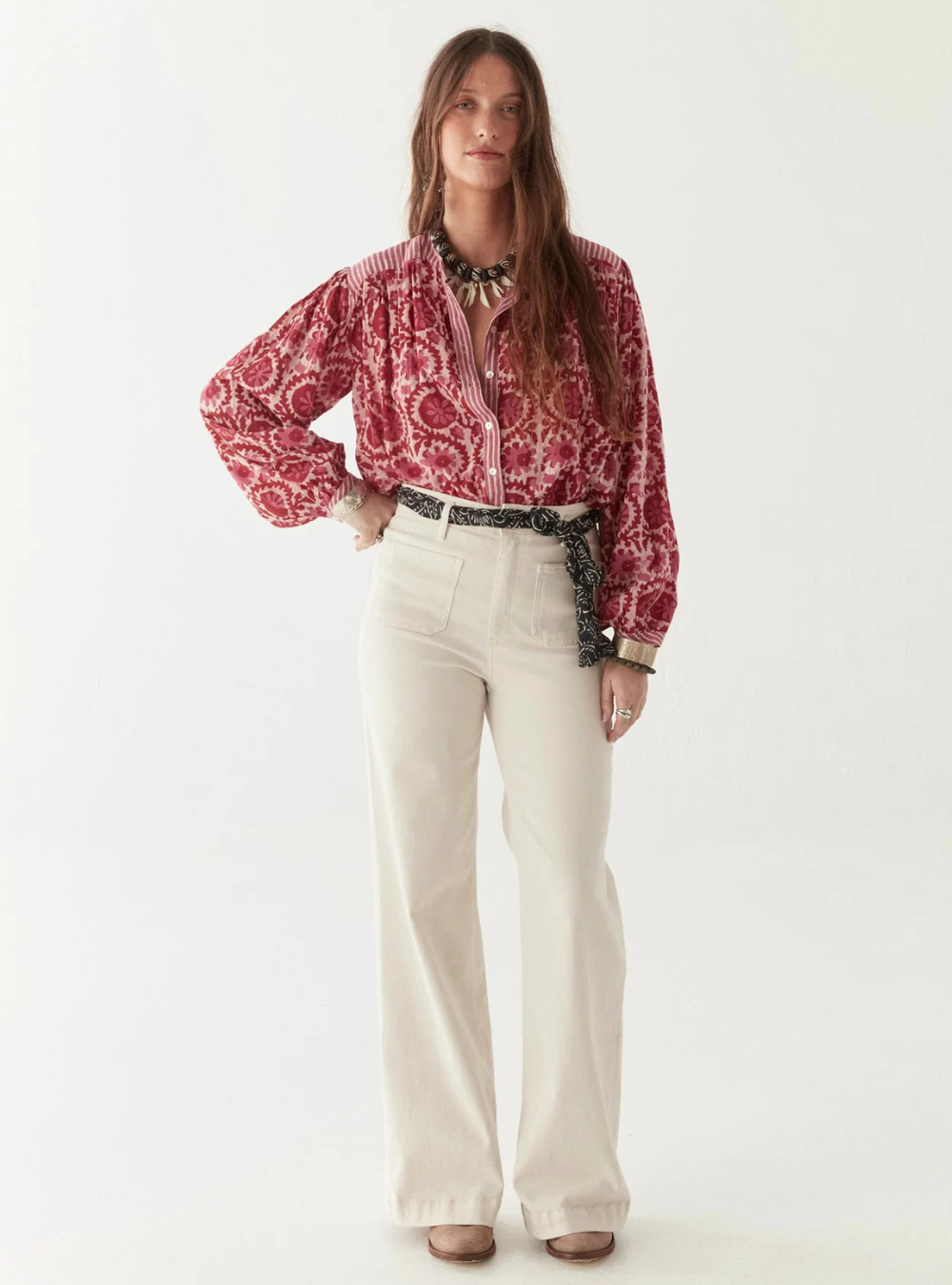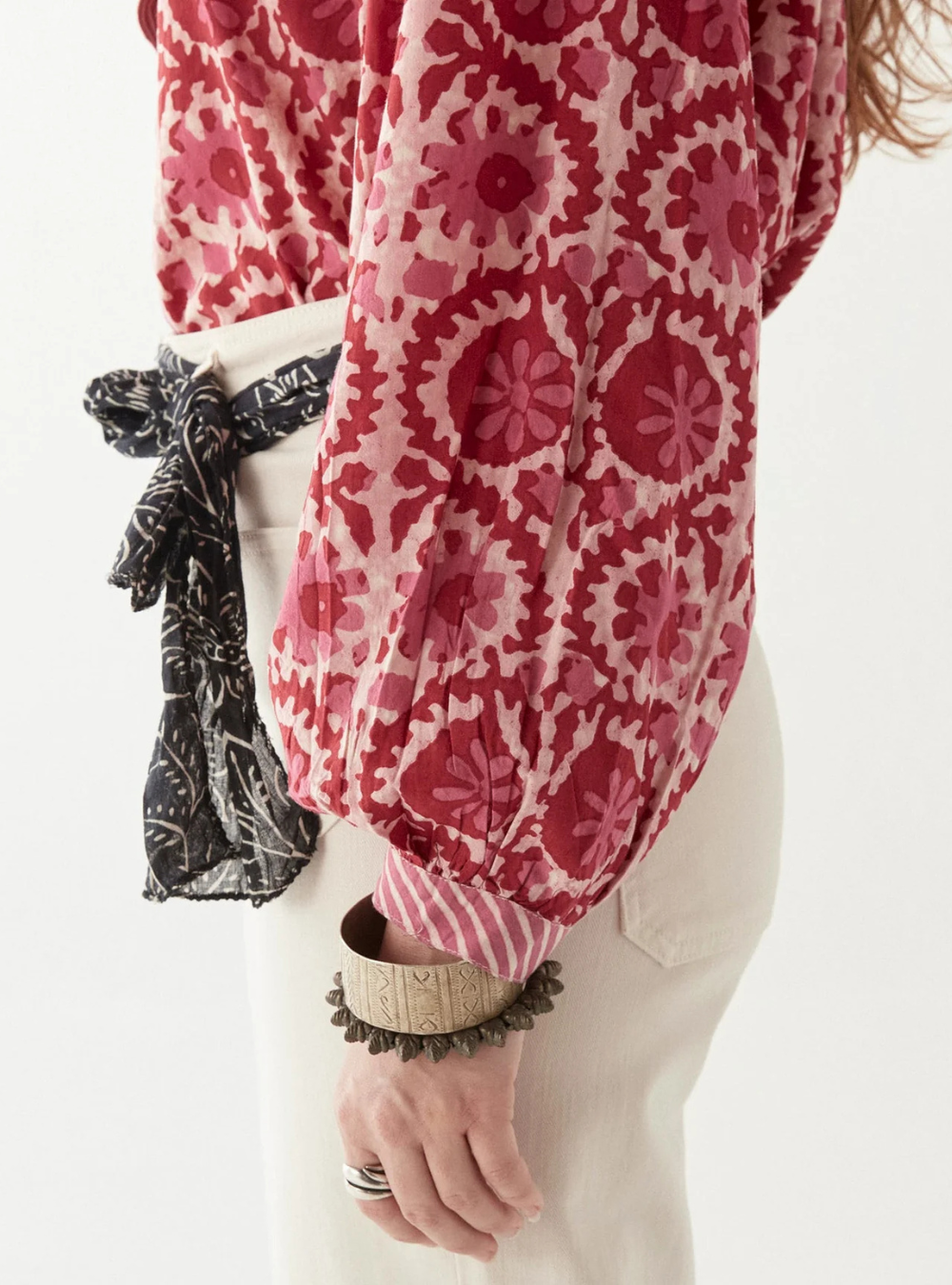 Leandra is all about bold vibes and fearless style. This blouse mixes vibrant floral patterns with sharp stripes that clash instead of blend, creating a standout look. Its billowy balloon sleeves give you room to breathe, while the soft fit moves with you effortlessly. It’s two styles, side by side—always aware but never merging. It’s not just about making a statement; it’s about sparking something fiery. Opposites don’t just attract here—they ignite.