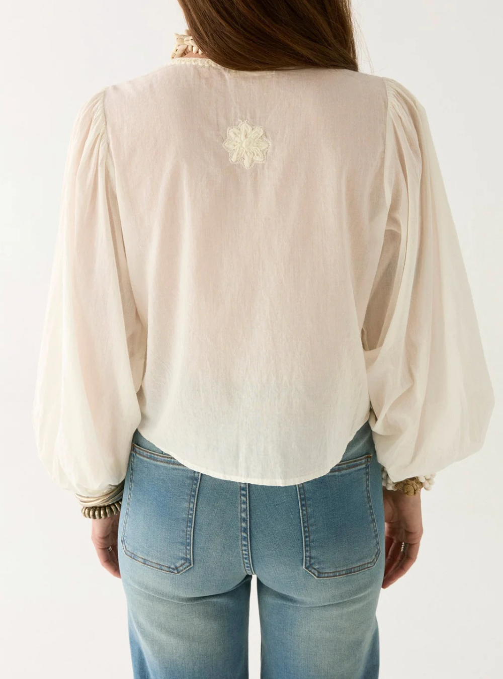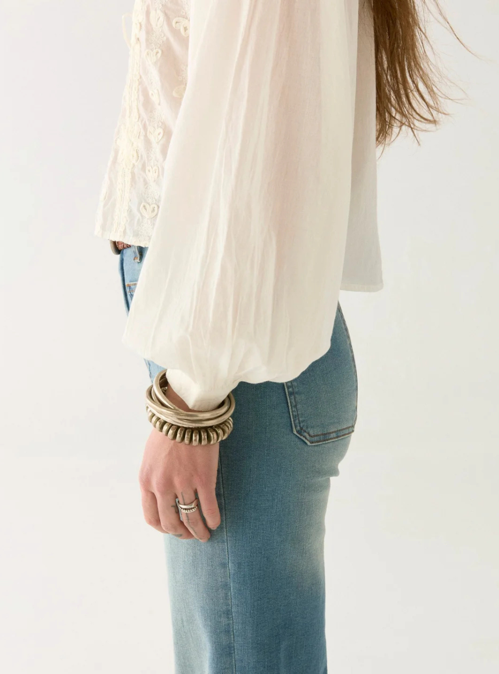 The Ludovica Blouse is where softness meets attitude. Light and airy cotton gives it a breezy feel, while lace inserts add unexpected boldness. Its billowing sleeves and cropped hem balance romance with edge. Whether buttoned up or left loose, paired with silk or denim, it effortlessly blends delicate charm with confident style. This blouse proves being soft doesn’t mean giving up your power.
