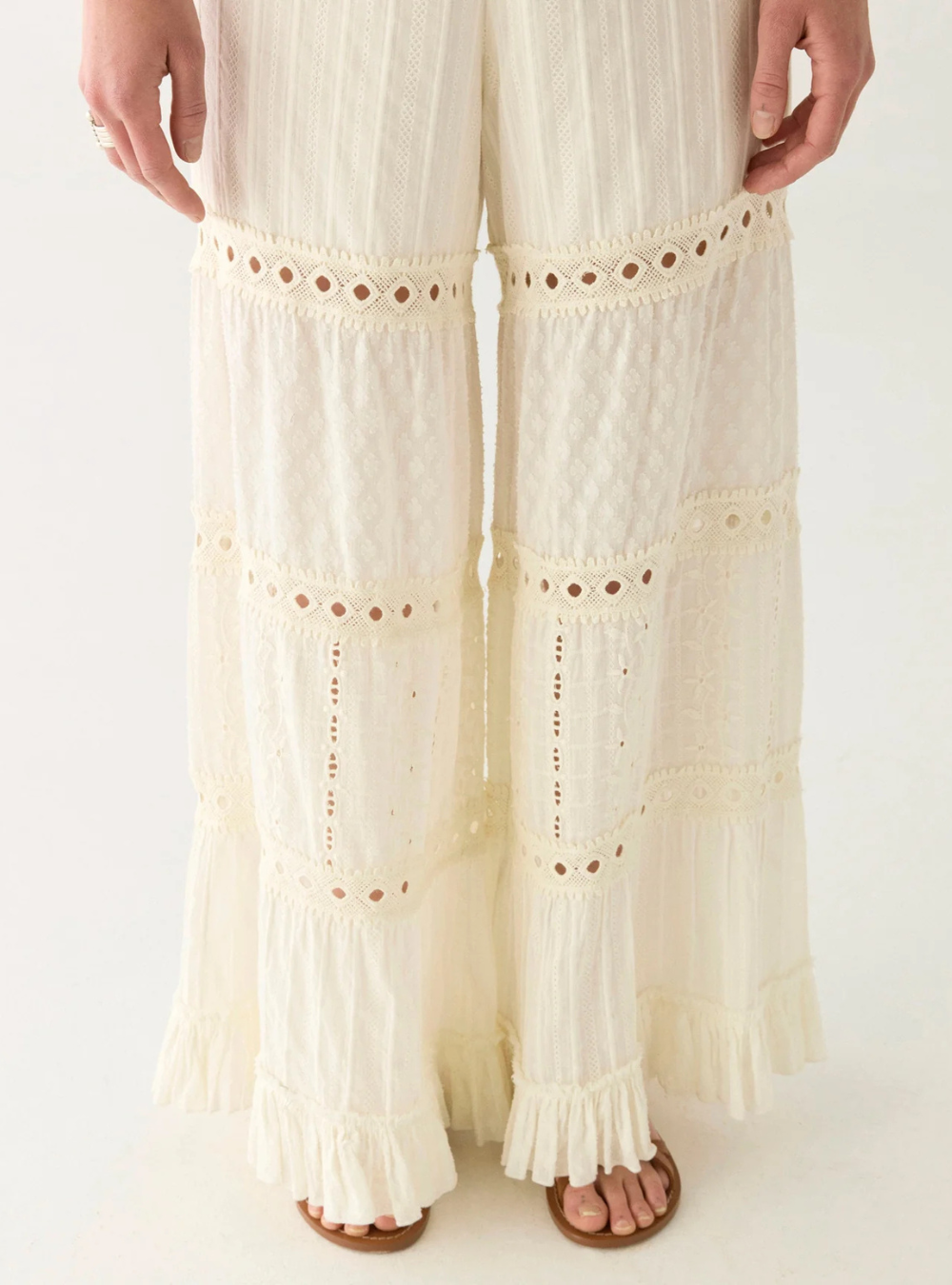 Designed for those unforgettable nights and quick getaways. These high-waisted pants fit snugly at the waist before bursting into lively movement. Featuring striped cotton and lace panels that flow down the legs, they flare out with endless energy. More than just walking—they’re dancing. The fabric breathes with every move, making every step count. Stillness is optional because these pants are made to move.