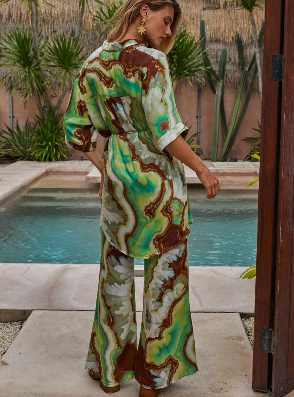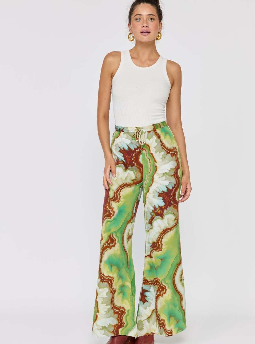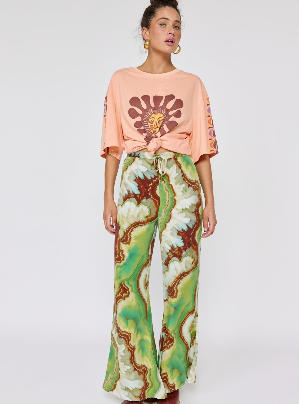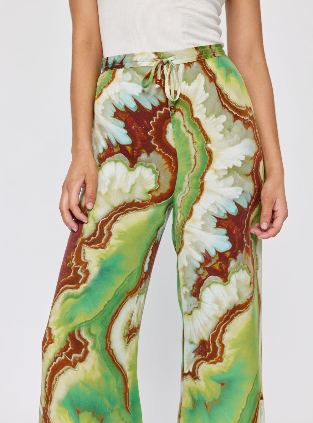 Make a statement in our Nadia Flares, designed with a comfortable elasticated drawstring waist for an easy, adjustable fit. Featuring a striking crystal geode photographic print, they bring a modern, artful edge to a relaxed silhouette. Effortless to style and comfortable to wear, these pants are perfect teamed with the matching Lois shirt dress & Erin top.