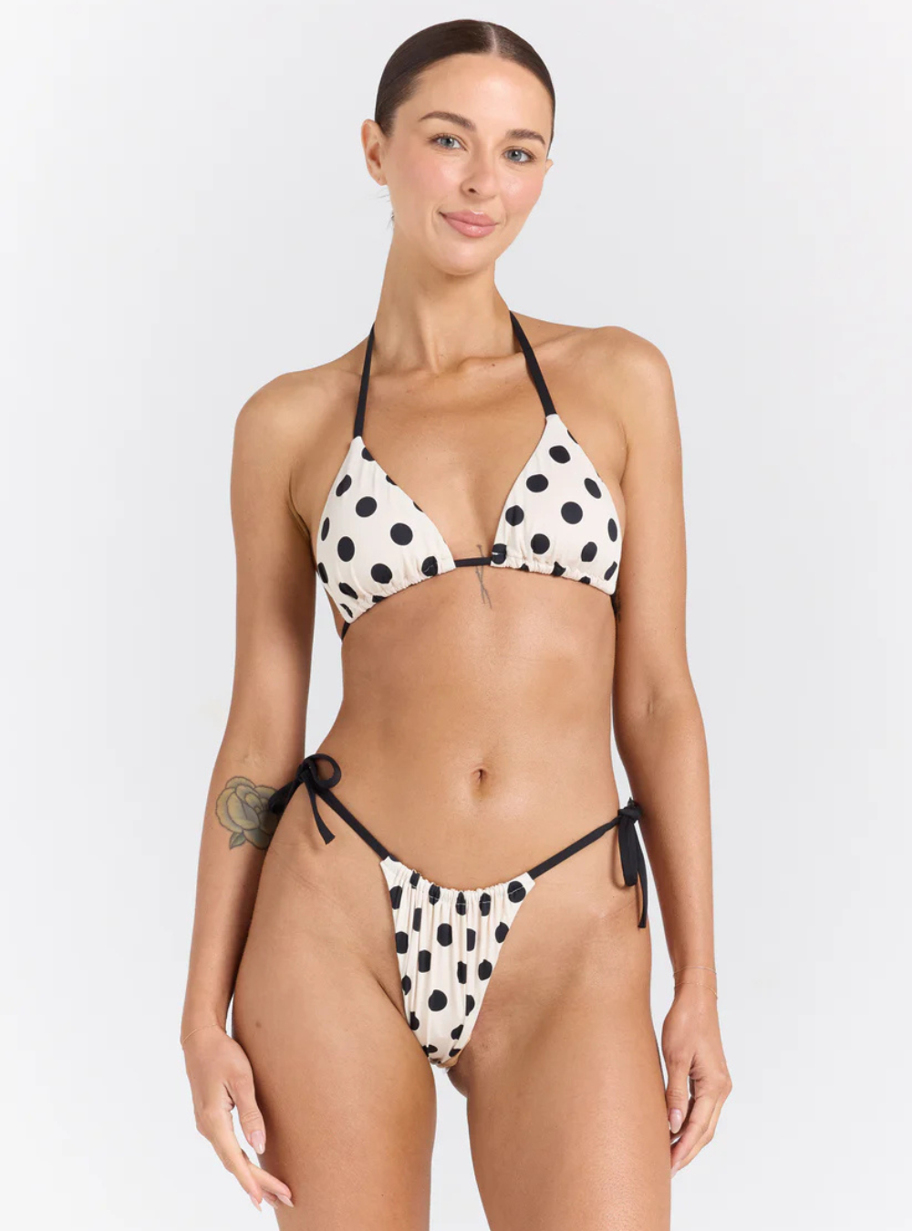 The Seaside String Tie Top is a fresh take on a retro favourite. Designed on a soft vanilla base with bold black spots, this top is finished with sleek contrast black binds for a modern edge. Crafted from butter-soft, smooth-touch fabric, it features adjustable neck and back ties for a custom fit. A timeless triangle silhouette made for sun-soaked days, salty skin, and seaside escapes.