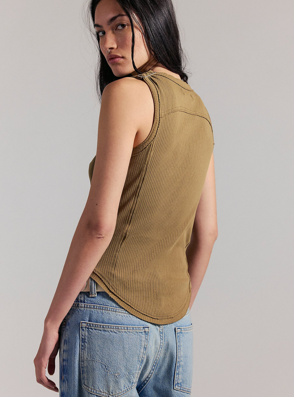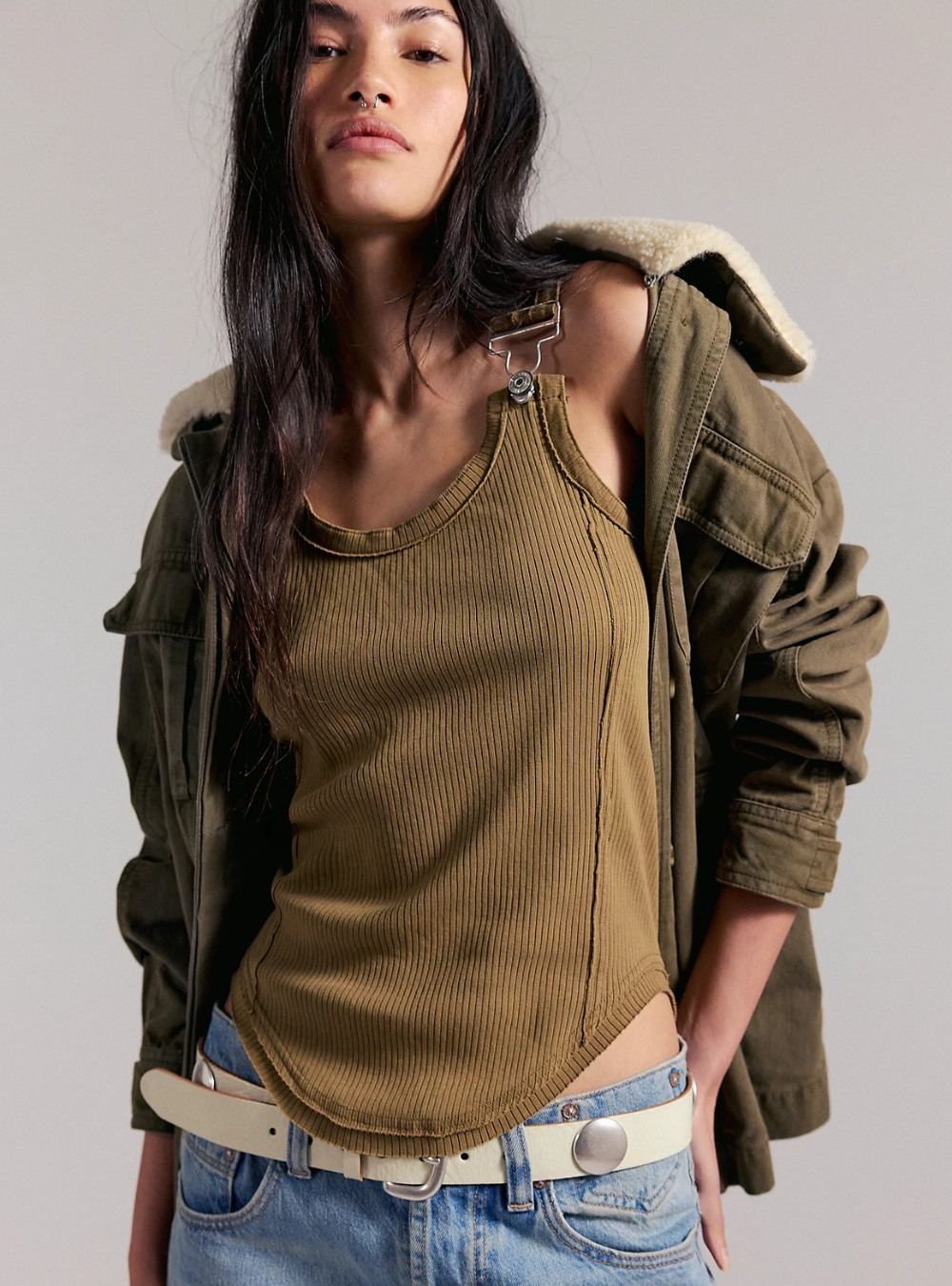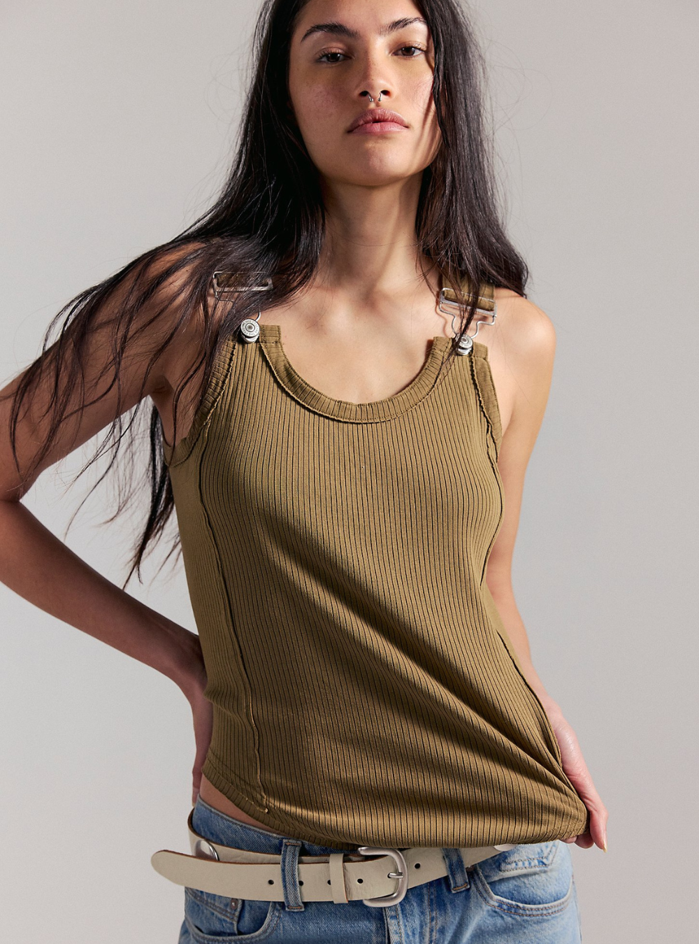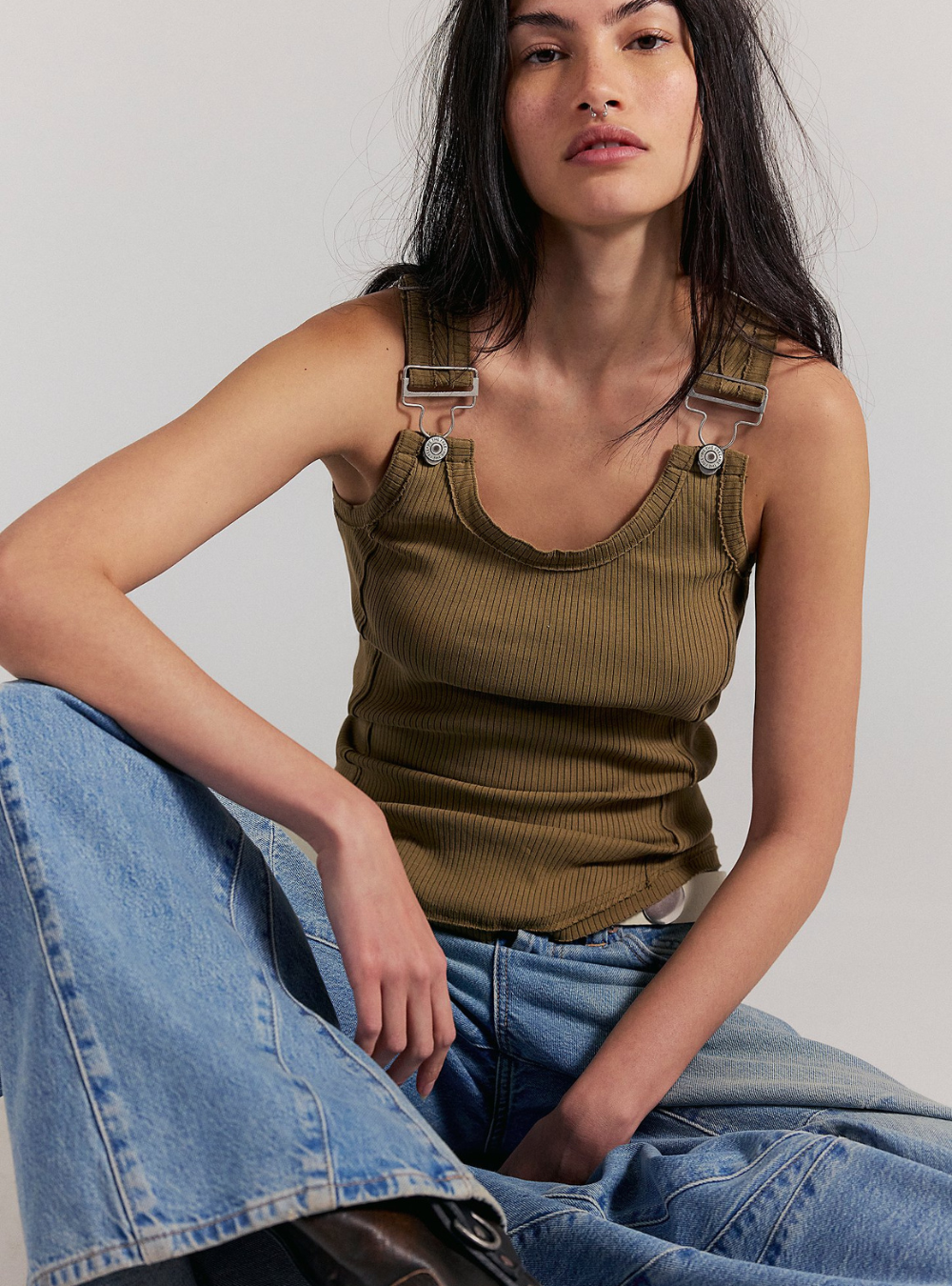 A staple tank gets a touch of edge with this hardware-adorned style from We The Free, featured in a ribbed fabrication with overall-inspired straps for an unexpected accent.