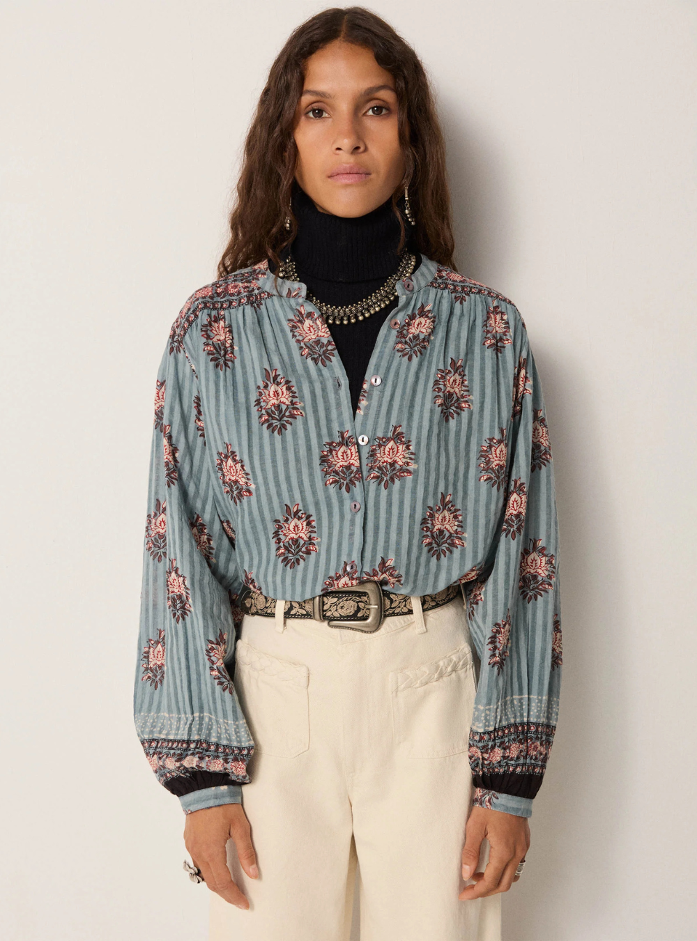 The Omara Blouse in Cerulean Mist is crafted from soft cotton dobby with fine woven stripes, giving it subtle texture and depth. Floral medallion prints in rich reds and blues add contrast against the cool cerulean base, creating a vintage-inspired feel with a fresh edge.
